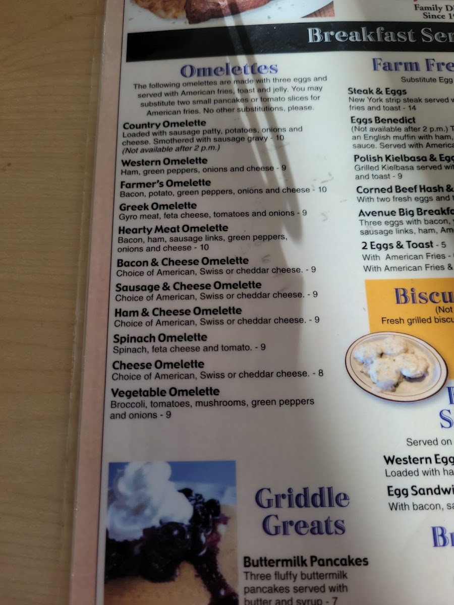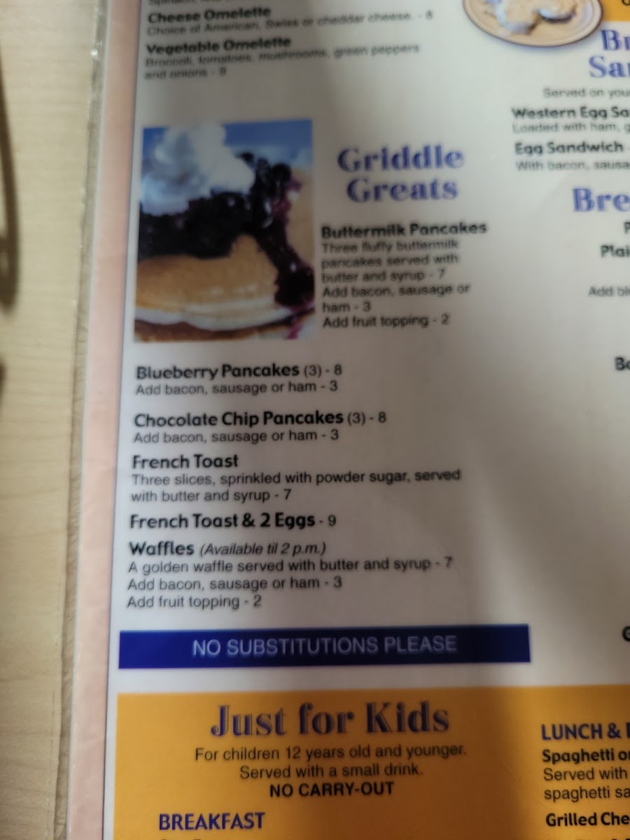 - Breakfast favorites like waffles, chocolate chip pancakes, and classic bacon and eggs